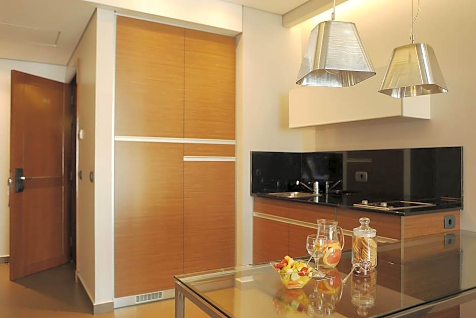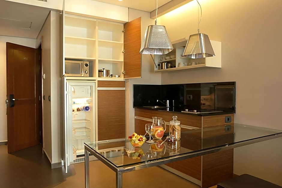 Located between the 7th and 11th floor, this spacious, air-conditioned suite features elegant interiors. It includes a flat-screen TV, an iron with an ironing board, black-out curtains and a fully equipped kitchenette with a microwave and a fridge. There is no possibility to add an extra bed in this room.